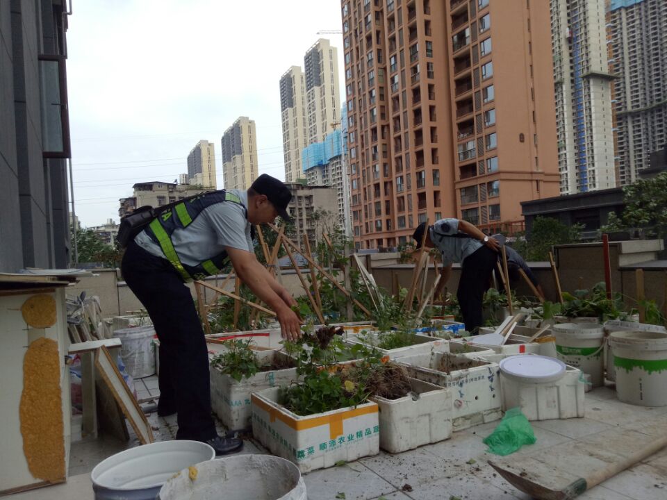 万景苑小区4栋2单元二楼公共平台似乎是一夜之间被搬上来好几十个大大小小的泡沫盒,而且里面装的全是泥土,泥土上面还有菜苗,好多品种。物业工作人员第一时间发现情况后,就在二楼挨家挨户询问,整层四户人家都没有一个承认的,都说没有种菜。奇怪了!是谁家的呢?大家只好暗暗侦查,6月20日,巡逻人员终于发现了蛛丝马迹,看到4-2-301业主在平台上捣鼓着什么,上前一看,原来是在给菜浇水,真是没想到,原来是楼上跑下来种的,我们平时把焦点都放在二楼的几户业主身上,忽视了三楼的业主。得知是301业主,物业人员立即上门要求其处理掉,但业主态度强硬,声称不是她家的,工作人员从手机里翻出她种菜时的照片,她看了一眼,终于承认了,并说她家就几盒,其余的都是别人家的,我们给了她几天的时间处理,其它的再去找下家。一个多星期过去了,301业主不但没有动静,而且还在继续种菜,根本没有要搬走的意思,发展到后来下雨时平台防水层也出现了问题,导致顶部严重渗水到单元门口,影响行人出行。