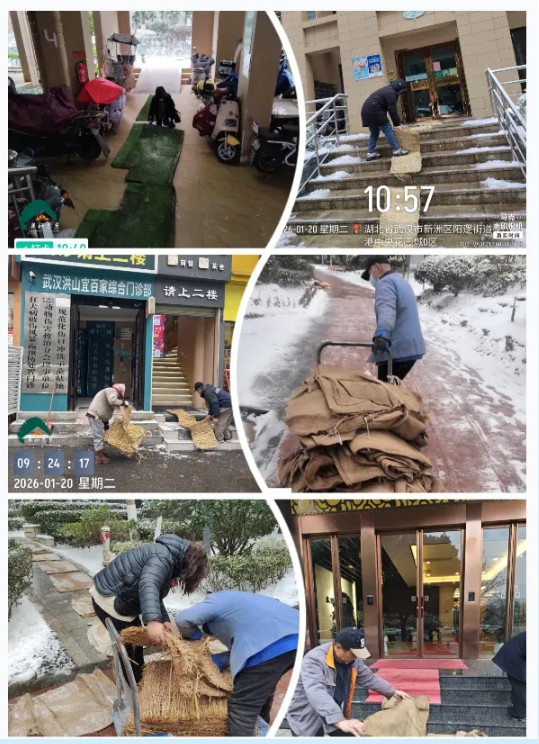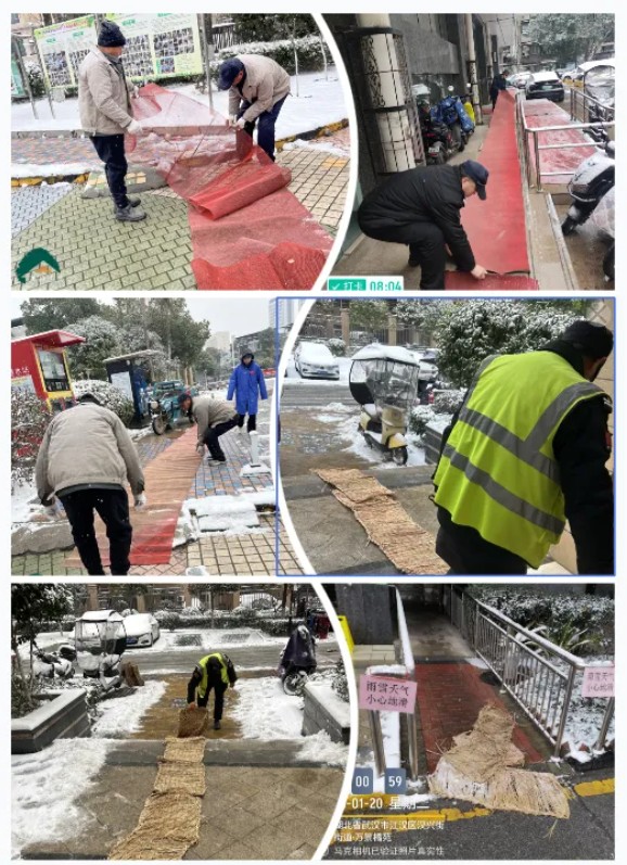 在大家的努力下,小区各要道、人行道已经清出了一条条畅通的“安全路”。雪会逐渐变小继而停止,但路面结冰却是人们出行的安全隐患。为防止路面结冰打滑,每清出一条路,物业工作人员紧跟着就铺上防滑垫。别看这些普普通通、不起眼的防滑垫,在大雪天里却是一份不可或缺的安全保障。看着业主们步履轻松地踏上防滑垫,少了那份小心翼翼,大家伙也安心了不少。