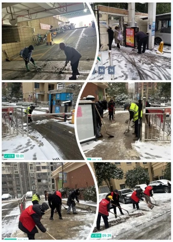 八点,未到上班的时间,各项目各部门不少人已提前到岗,在相关部门负责人的组织下,大家纷纷拿起扫帚、铁锹等工具 ,按计划各就各位,埋头弯腰清除积雪。不一会儿,呈现于人们眼前的是一幅热火朝天的扫雪图。在主干道、单元门前、停车场、人行道上,物业人员在奋力铲雪,铁锹与冰层碰撞的“叮当”声、扫帚清扫积雪的“沙沙”声,交织成冬日最动人的奋进曲。雪越下越急,风也呼呼刮起,寒风冻红了脸颊,冻僵了双手,雪花落满了肩头,却挡不住物业人为业主清扫“安全路”的热情。